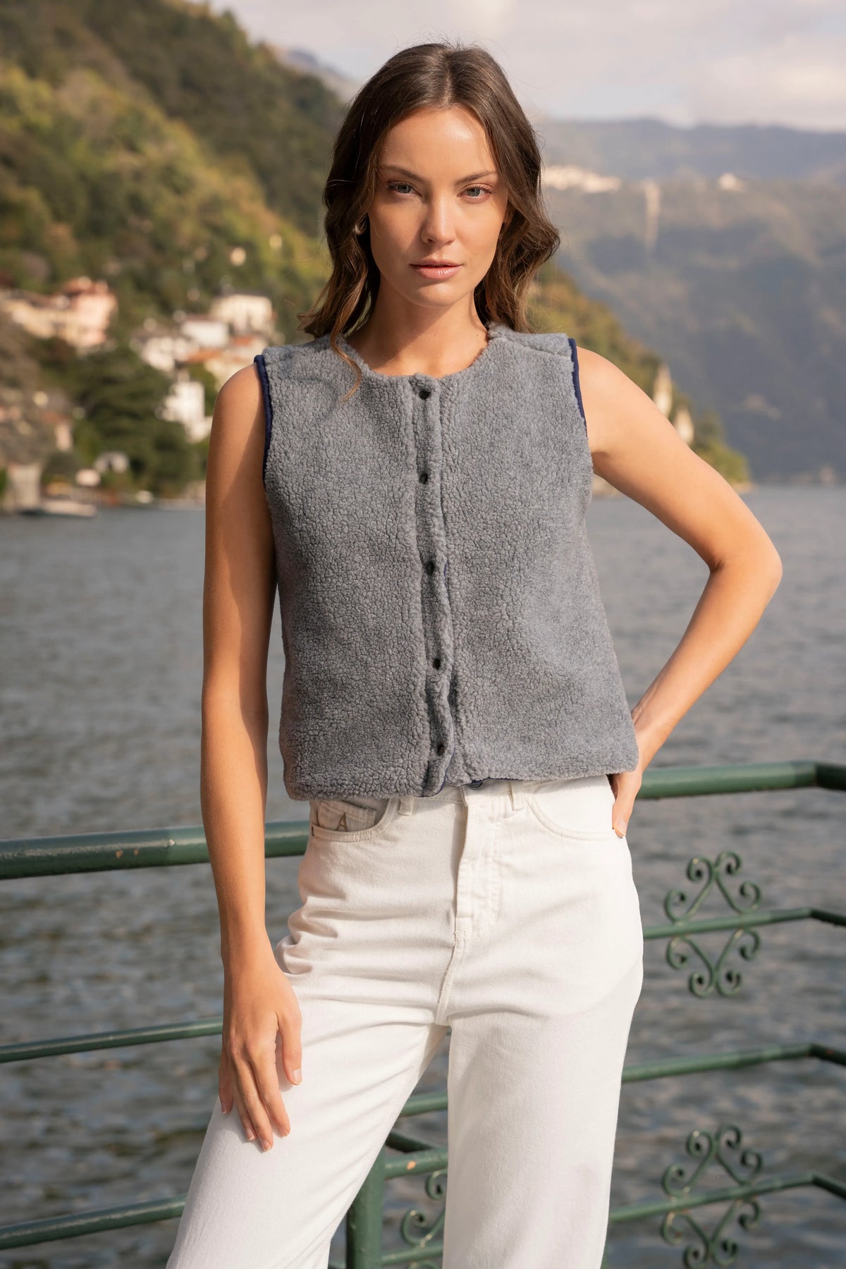 El Chaleco Polar Reversible combina la textura cálida del borrego con la estructura limpia de su reverso en tela lisa, logrando un equilibrio entre comodidad y estilo.